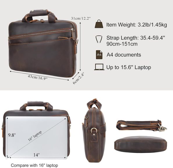 • 【Multifunctional Leather Bag】This slim laptop bag is best for men’s daily use or business trip. Its spacious main compartment and various inner pockets easily organize your essentials and accessories, such as laptop, cellphone, power cords, mouse, A4 file, wallet, pens, books and more.