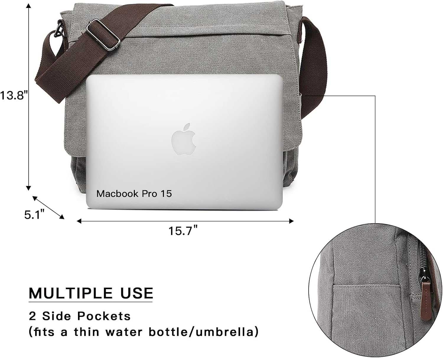 - SIZE:15.7″W x 13.8″H x 5.1″D,comfortably fit a 15″ laptop, shoulder strap:46″, adjustable. The canvas messenger bag is lightweight, compact, vintage, easy to care for, and functional.