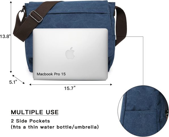 • SIZE:15.7″W x 13.8″H x 5.1″D,comfortably fit a 15″ laptop, shoulder strap:46″, adjustable. The canvas messenger bag is lightweight, compact, vintage, easy to care for, and functional.