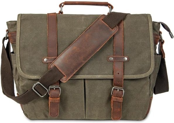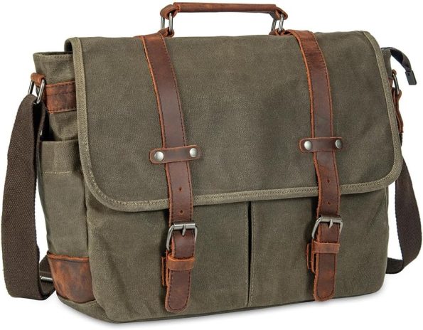 - HIGH-GRADE MATERIALS : Waterproof Waxed Canvas Men’s Vintage Genuine Leather Laptop Messenger Bags. original wax canvas + superior cowhide leather+bronze hardware. Durable Leather and adjustable shoulder strap.