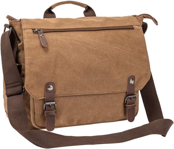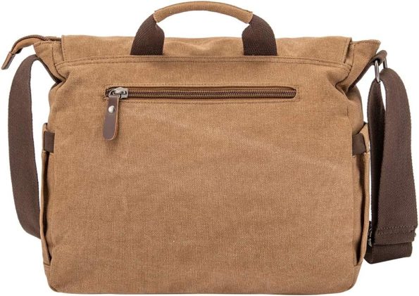 • MULTI-COMPARTMENT: This canvas laptop bag is vintage and multifunctional with lots of pockets. 1 zipper pocket in the front flap; 1 zipper pocket under the flap which is fitted with 3 pen slots, card slots; 1 large main zipper pocket: 1 inner zipper pocket; 1 inner cushion padded laptop compartment; 1 back zipper pocket. A 14-inch laptop, iPhone, wallet, snacks, tickets and magazine will all fit comfortably with room left over for add-ons.