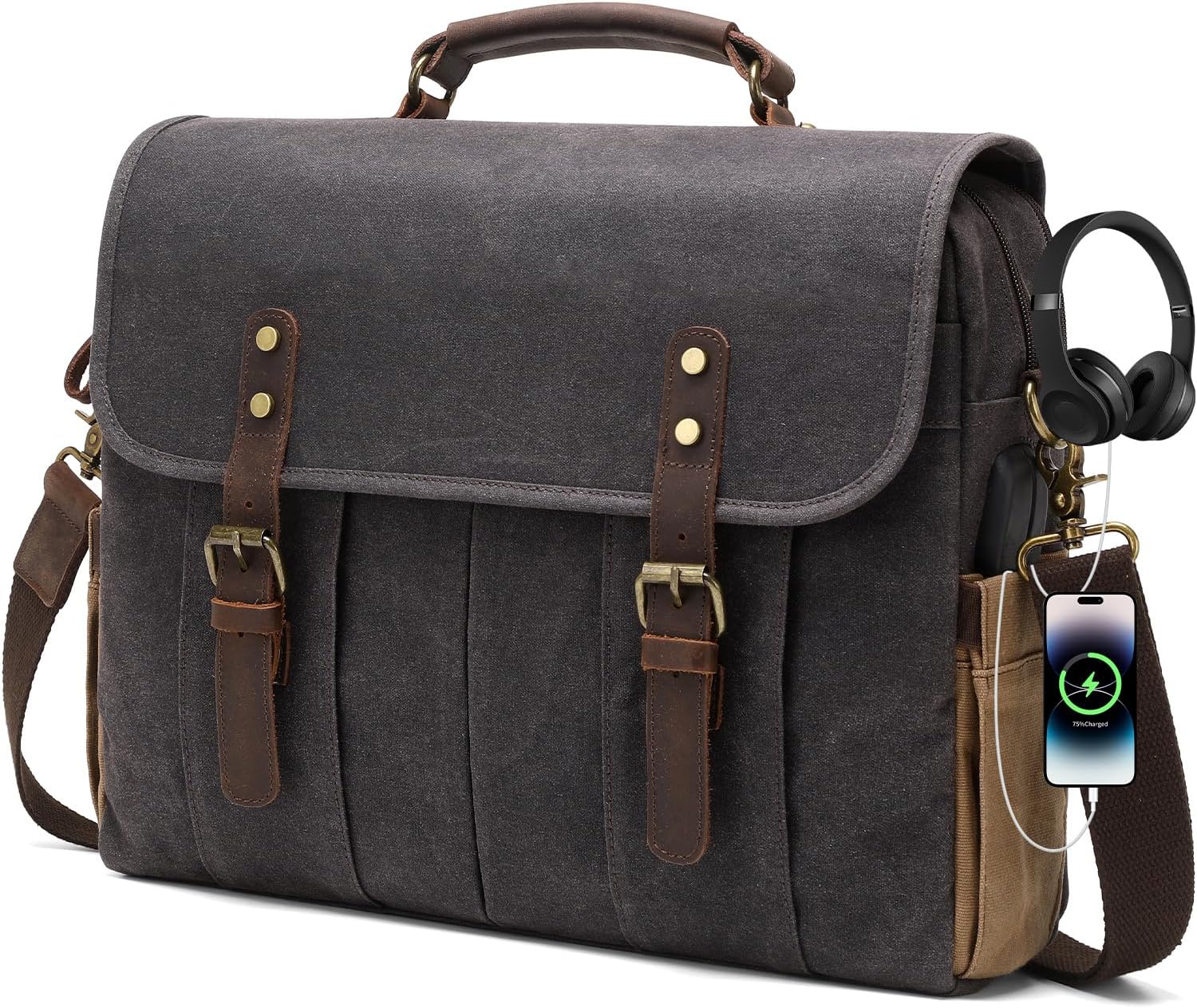 Vintage Men’s Messenger Bag 15.6 inches Waterproof Genuine Leather Waxed Canvas Satchel Shoulder Bag Briefcase Laptop Bag with Charging,Headset Port Gray